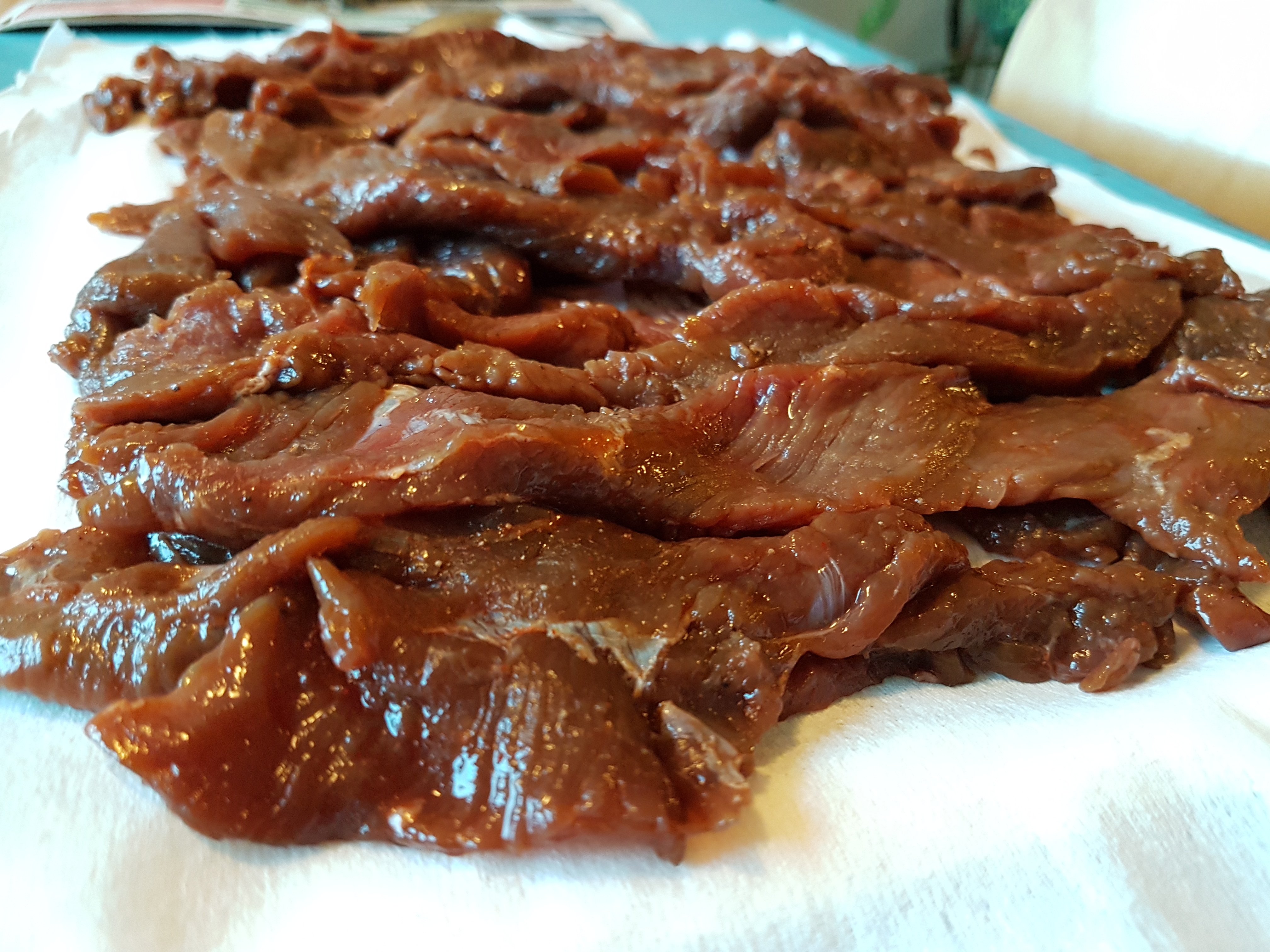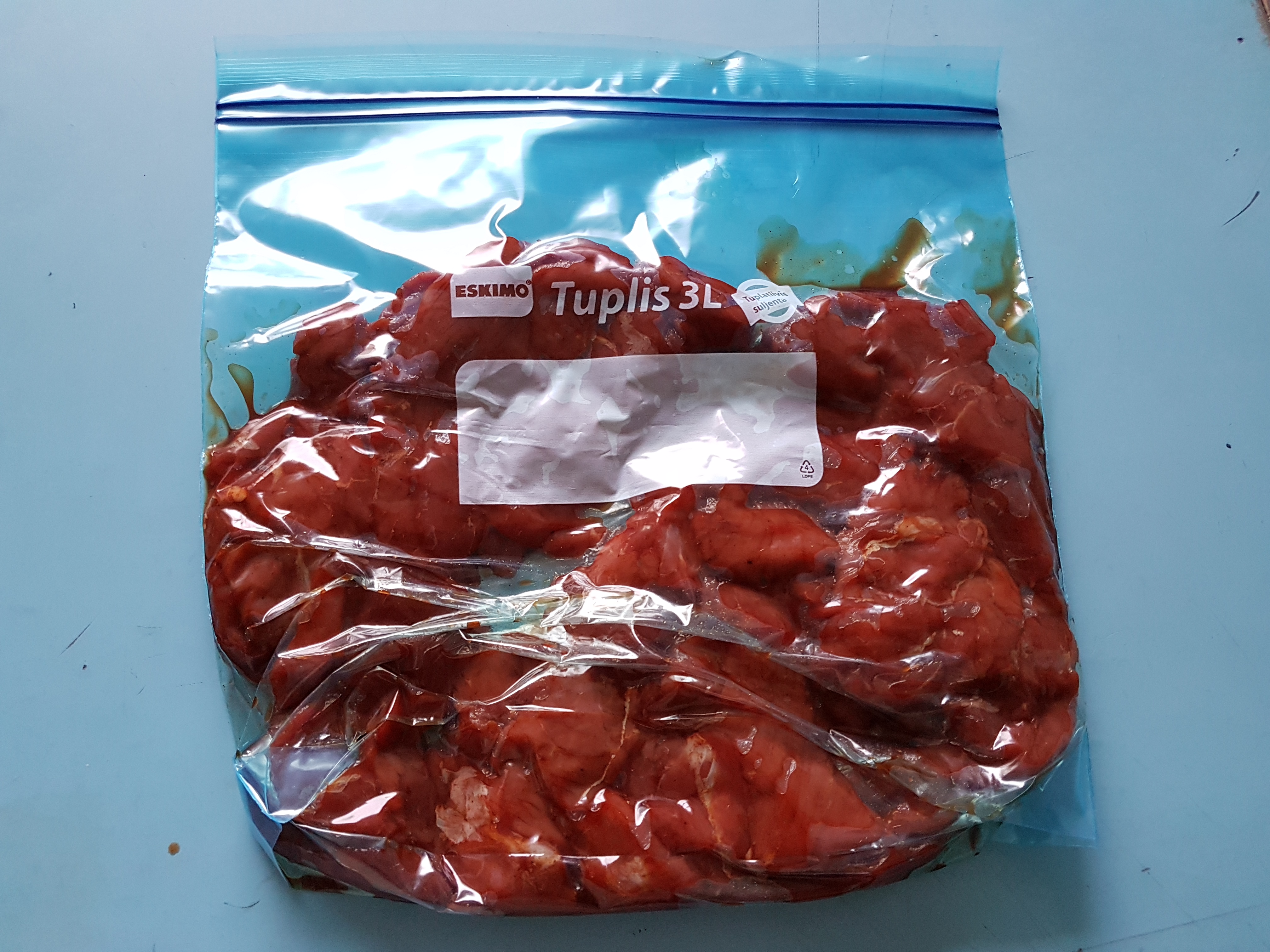 Lihapala suikaloitiin parin millin paksuisiksi suikaleiksi. Lihasuikaleet maustettiin soijalla, mustapippurilla ja savupaprikalla. Lihat laitettiin marinoitumaan tuplispussissa yön yli jääkaappiin.