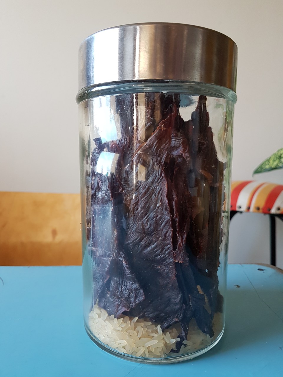 Kuudessa tunnissa oli liha kuivaa. Maistiaiset osoittivat testin onnistuneen hienosti. Kuivaliha laitettiin lasipurkkiin odottamaan vaellusta. Purkin pohjalla oleva riisikerros imee mahdollisen kosteuden ja pitää lihat kuivina.