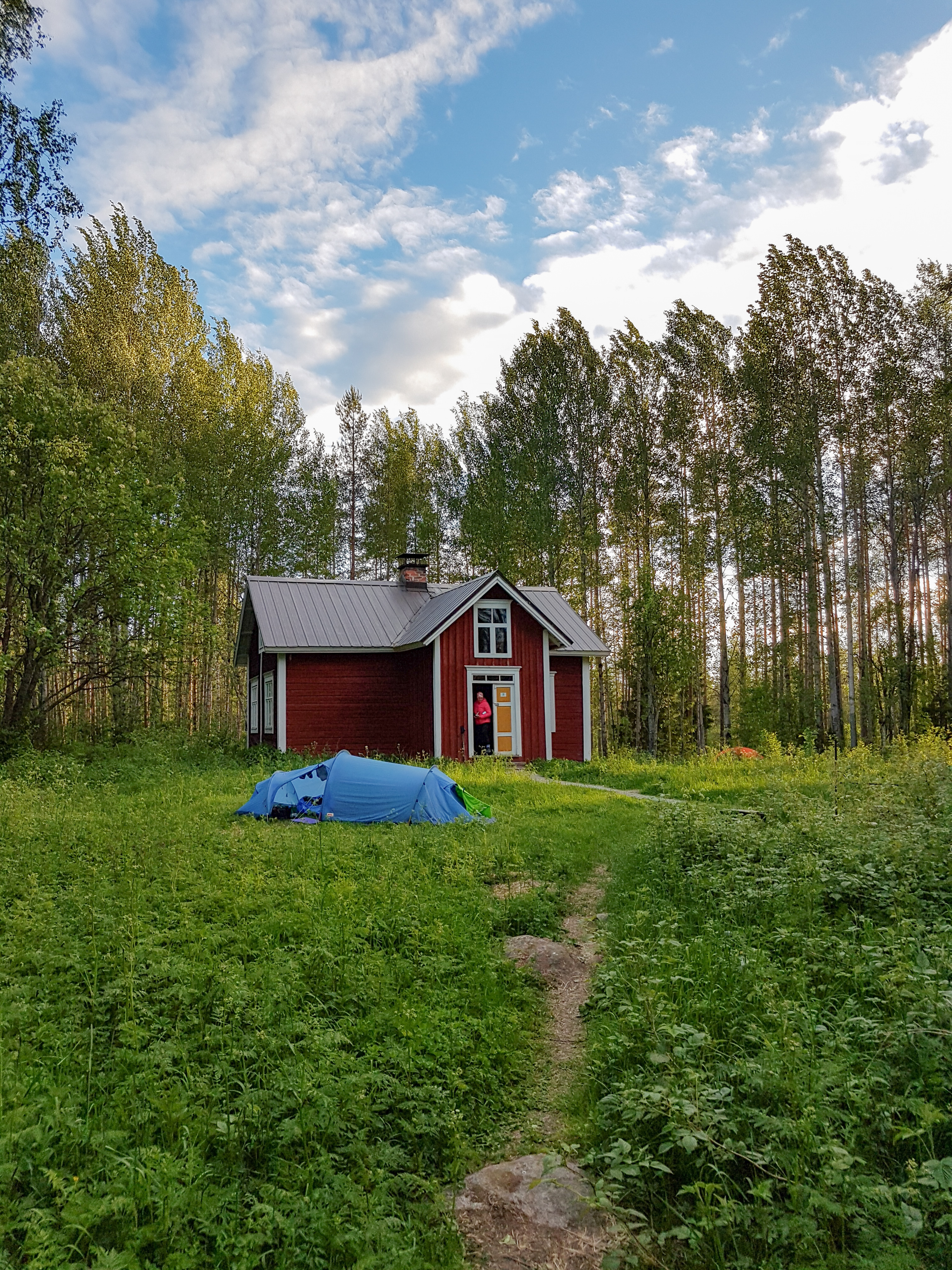 Tupaan oli uusittu katto ja kamiina edellisen käynnin jälkeen. Viritimme heti varusteet kuivumaan ja kamiina lämmitti pienen kämpän nopeasti. Tuona päivänä oli Vesan synttärit, joten juhlistimme iltaa hyvällä ruualla, rennolla oleskelulla ja muutamalla viskinaukulla. 15 kilometrin pikataipaleen jälkeen teki hyvää olla ihan rennosti.
