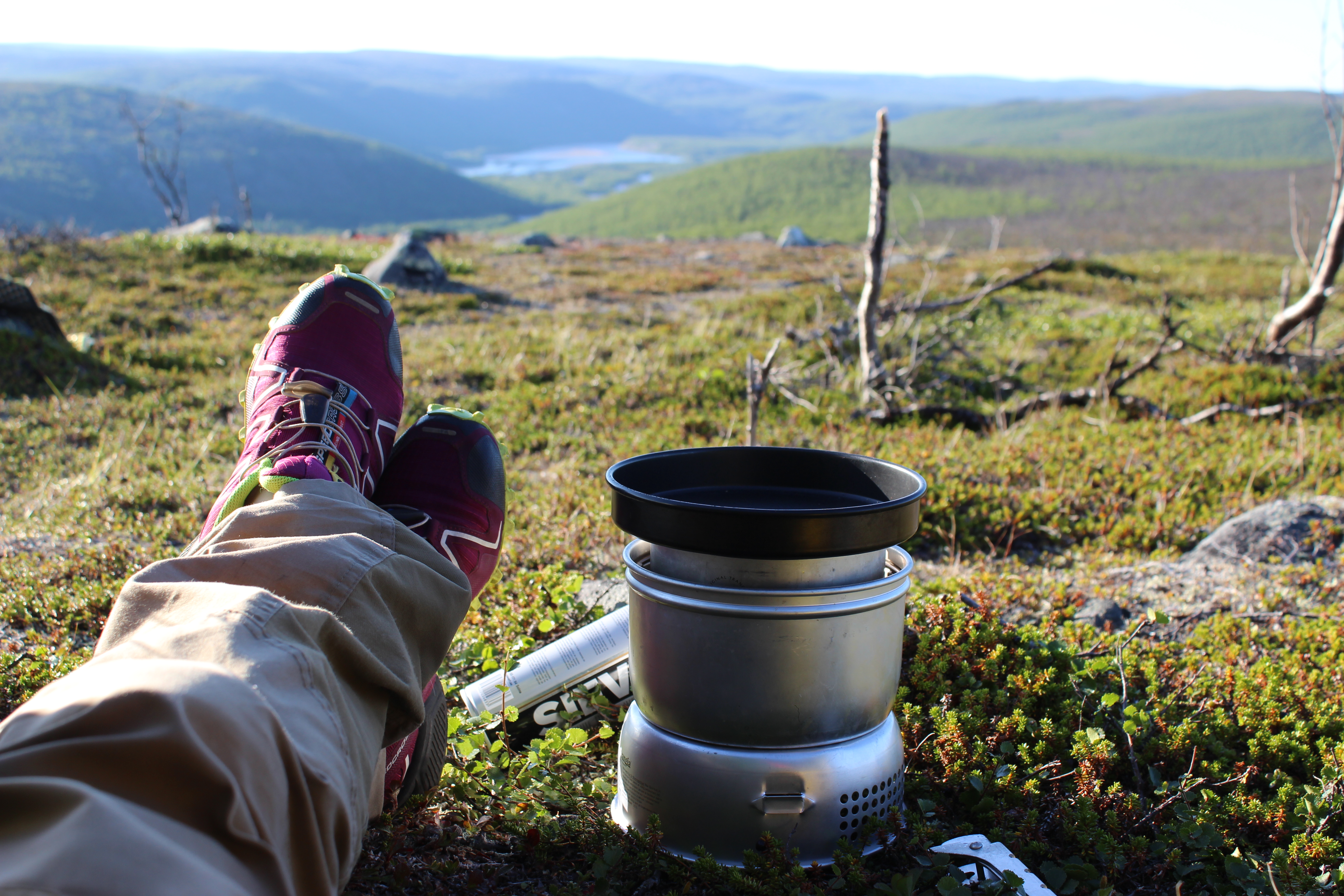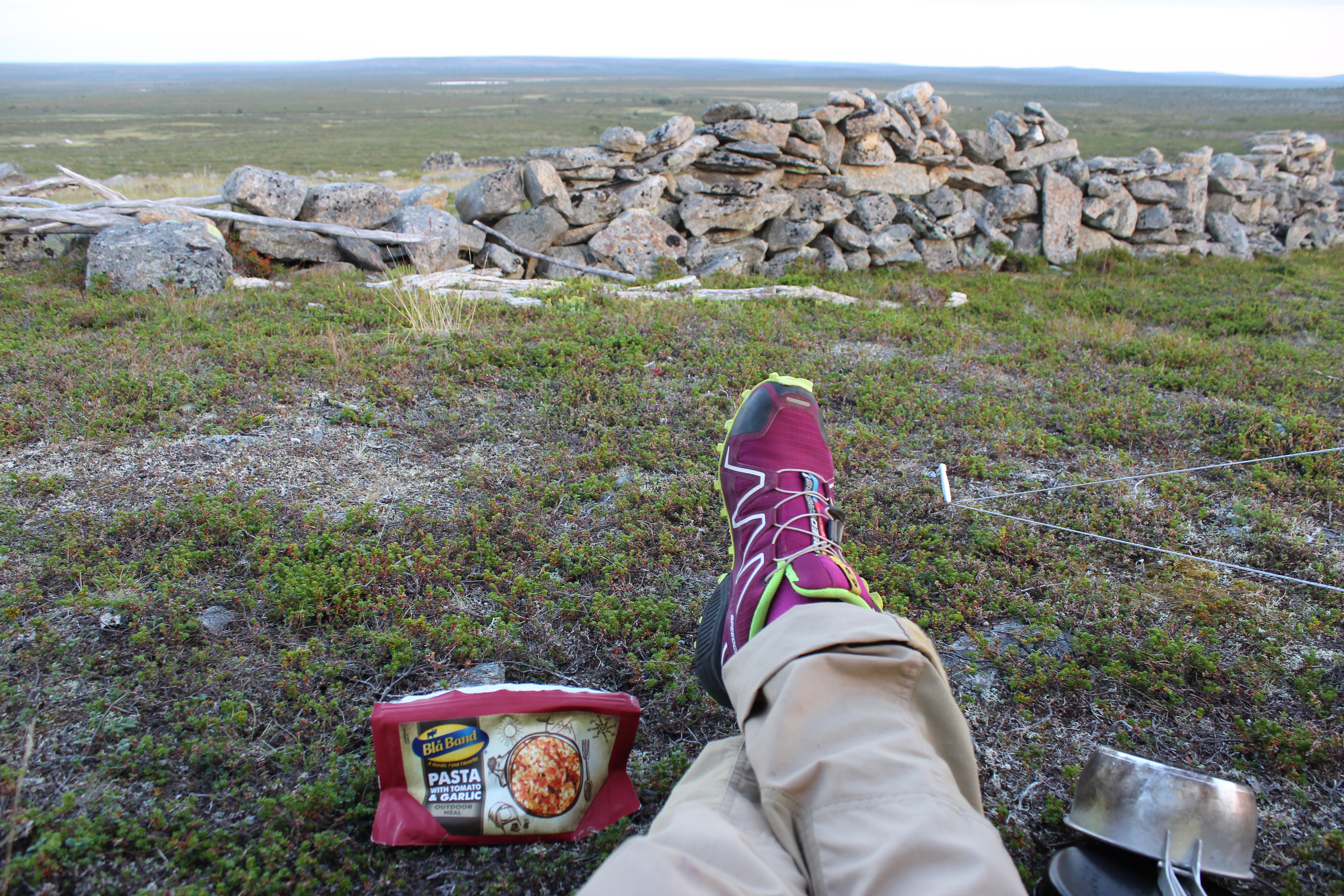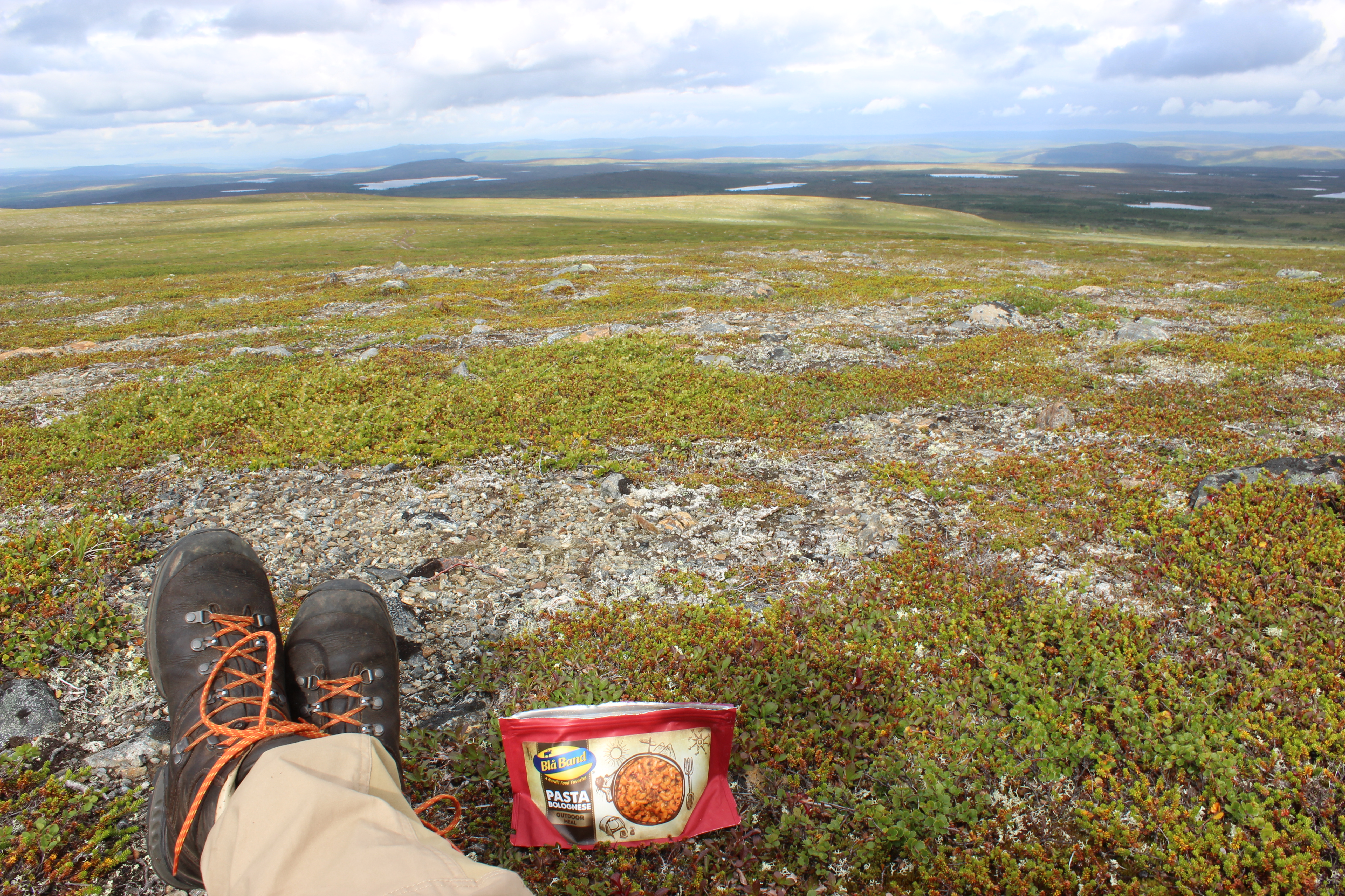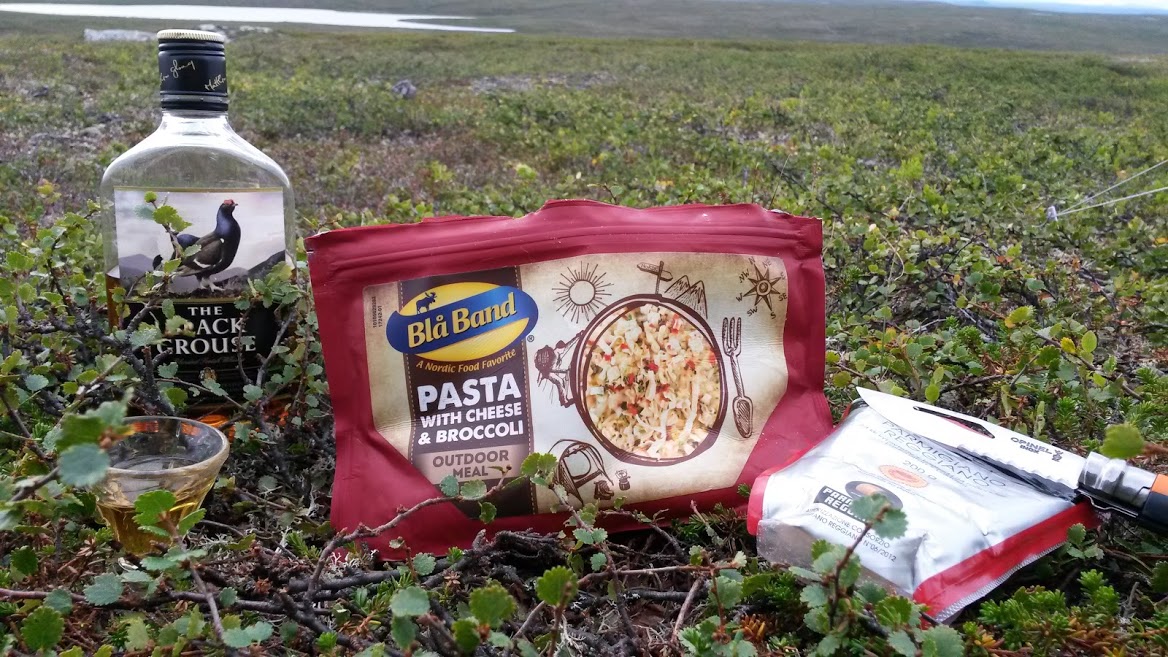 ”Valmiit sekoitukset ärsyttää jo nyt. Olisi pitänyt jättää lisukkeet erikseen niin olisi voinut laittaa mitä mieli tekee. Ja tätä on vielä kolme viikkoa!!!” Kesken syömisen meni taivas pilveen ja taivaanranta alkoi täyttymään yhä tummemmista muhkurapilvistä. Päätin nauttia sateettomasta hetkestä, sateessa voi sitten kävellä. Köllöttelin ruuan jälkeen makuualustalla variksenmarjaviidakossa ja katselin pilvien liikkumista.