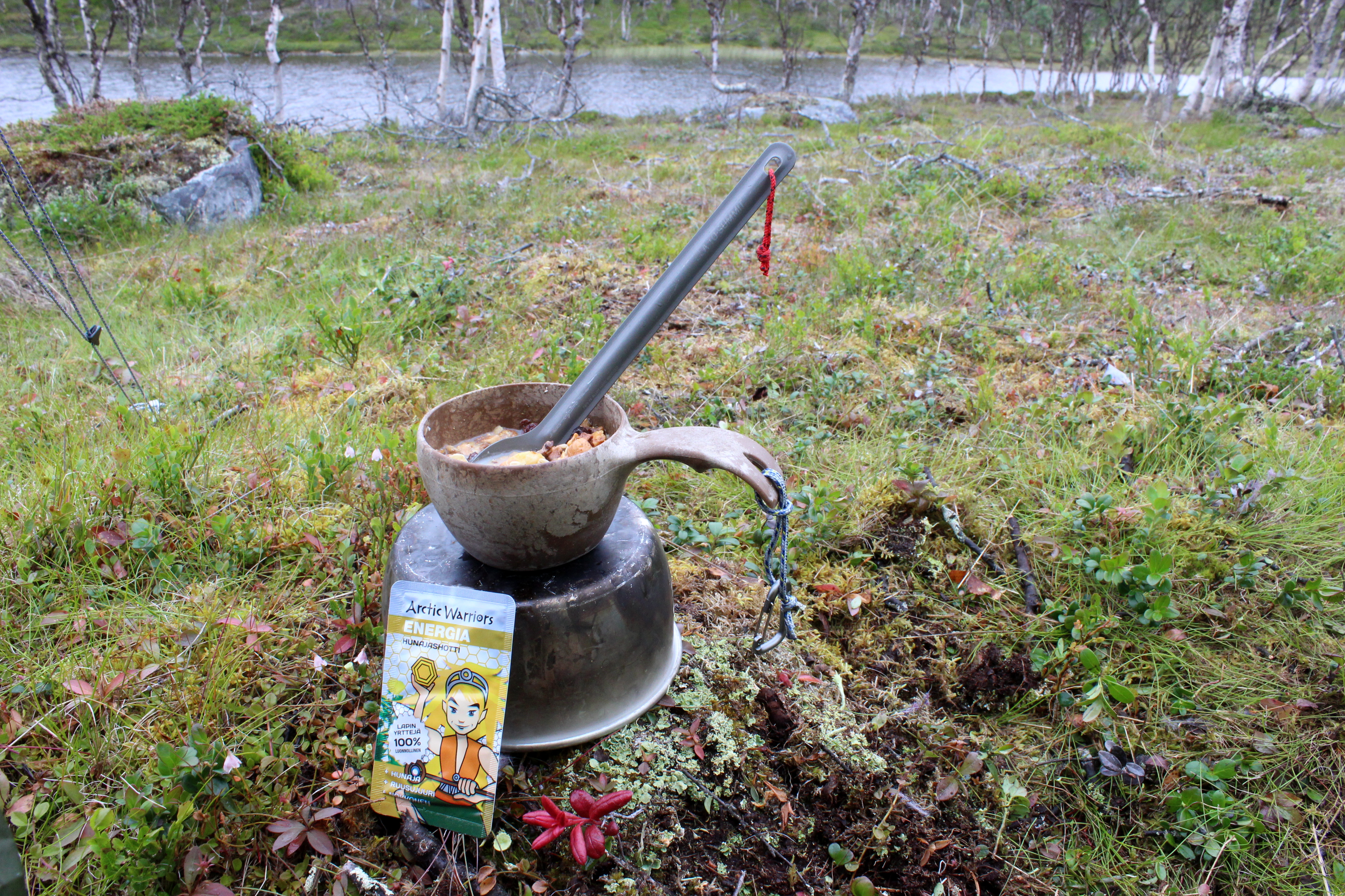 Aamulla teltan oven avattuani ei näkynyt muuta kuin valkoista. Sankka sumu oli verhonnut tunturit ja näin maksimissa viisi metriä eteenpäin. Teltta oli kerännyt kosteutta ulkoteltan sisäpinnalle. Aloin aamiaisen laittoon. Vesi meinasi olla tarkalla, en ollut valmistautunut tällaiseen telttapaikkaan. Keli kuitenkin määräsi. Sain vedestä aikaiseksi kuksallisen kahvia ja pienen annoksen mansikkariisipuuroa.