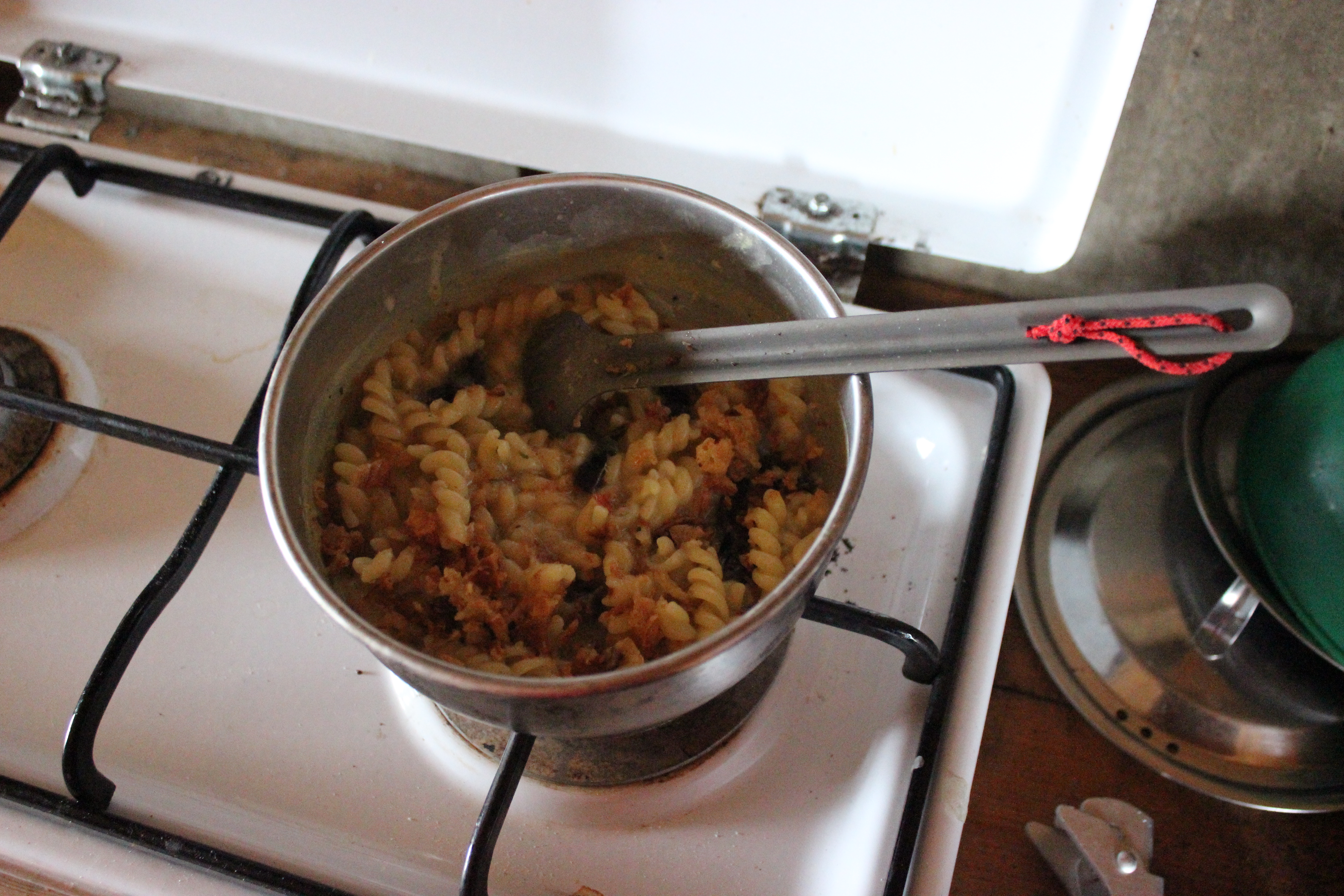 Tulin järvelle ja halusin saada muuta lounasta kuin pastaa. Heittelin ties kuinka kauan virveliä, mutta mitään ei tapahtunut. Läksin seuraamaan järvestä laskevaa puroa. Puro mutkitteli ja reilun kilometrin jälkeen se laski pahaiseen suolampeen, josta uistimeen tarttui vain heinää. Pastaa siis jälleen.